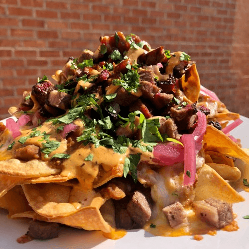Refried beans, jack & cheddar cheese, pickled jalapeños & red onions & chipotle aioli. Choice of chicken, brisket, pulled pork or pork belly