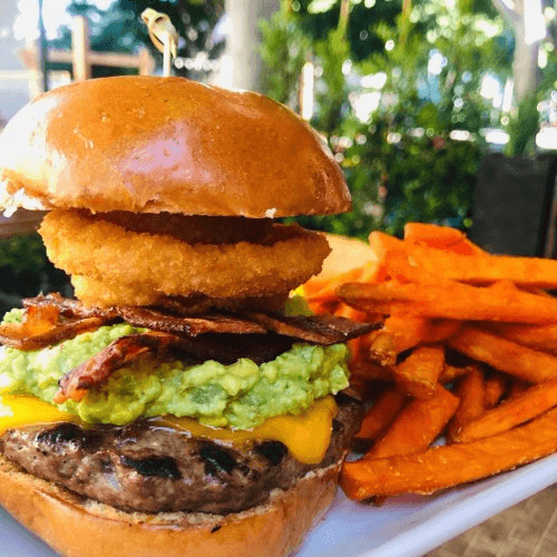 1/2 lb. Beef patty grilled to order topped with bacon, onion rings, cheddar cheese & fresh guacamole