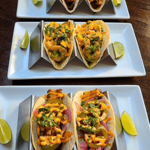 2 tacos with sautéed shrimp, fresh mango salsa and chipotle aioli
