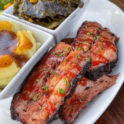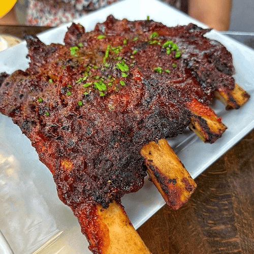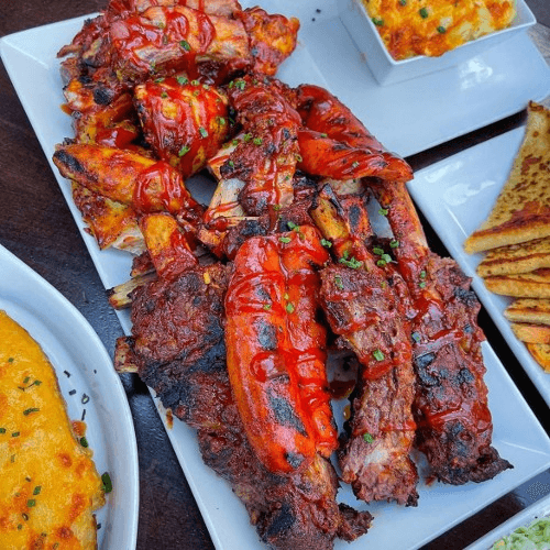 1/2 rack of each of our ribs: baby back and beef ribs, BBQ chicken plus 2 hot links and 3 large side dishes. Great for sharing!