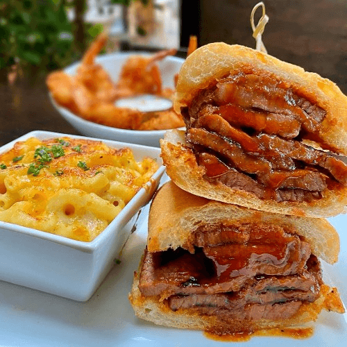 1/2 lb. Cheeseburger, pulled pork, onion rings, pickles, garlic aioli & house BBQ sauce. Served on a brioche bun