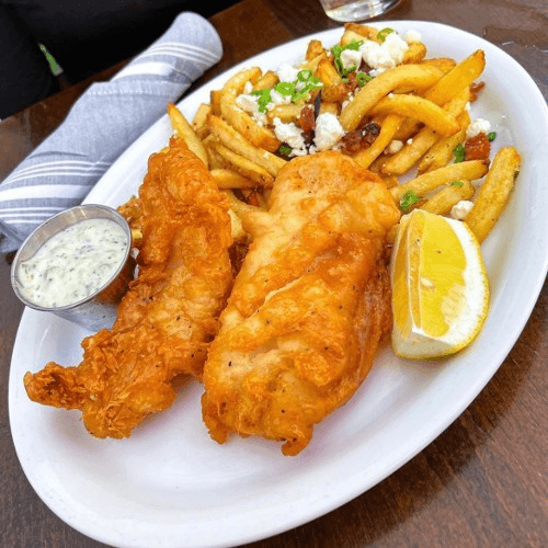 Beer battered cod. House made fries topped with applewood bacon& feta. Served with house made tartar sauce