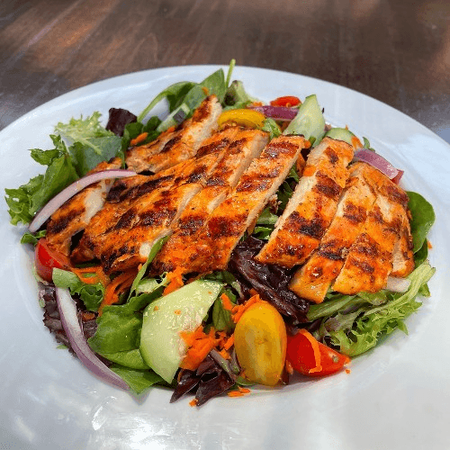 Grilled boneless chicken breast served on a fresh garden salad with your choice of dressing
